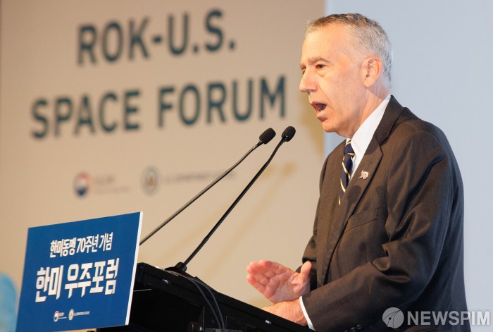 [서울=뉴스핌] 윤창빈 기자 = 필립 골드버그 주한미국대사가 6일 오전 서울 용산구 그랜드하얏트호텔에서 열린 한-미 우주포럼 개회식에서 축사를 하고 있다. 2023.11.06 pangbin@newspim.com