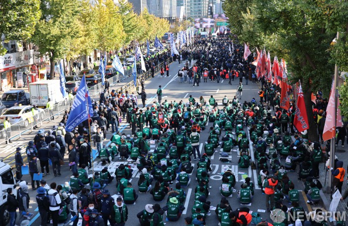 [서울=뉴스핌] 양윤모 기자 = 민주노총·윤석열정권퇴진운동본부가 11일 오후 2시 서울 서대문구 서대문역 사거리에서 '노동자대회 및 민중총궐기' 집회를 개최하고 있다. 이로인해 통일로 왕복 8개 차로 6개가 집회로 통제되었으며 이번 대회는 경찰이 지난 9월 불법 집회에 대한 강경 대응을 담은 '집회·시위 문화 개선 방안'을 발표한 이후 처음 열리는 대규모 집회이다. 2023.11.11 yym58@newspim.com