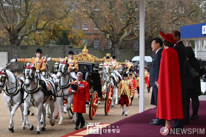 [서울=뉴스핌] 윤석열 대통령이 21일(현지시간) 런던 호스가즈 광장에서 열린 공식 환영식이 끝난 뒤 버킹엄궁으로 타고 갈 마차 행렬을 바라보고 있다.[사진=대통령실] 2023.11.22 photo@newspim.com