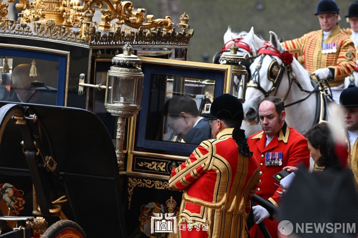 [서울=뉴스핌] 윤석열 대통령이 21일(현지시간) 런던 호스가즈 광장에서 공식 환영식이 끝난 뒤 버킹엄궁으로 타고 갈 마차에 오르고 있다.[사진=대통령실] 2023.11.22 photo@newspim.com
