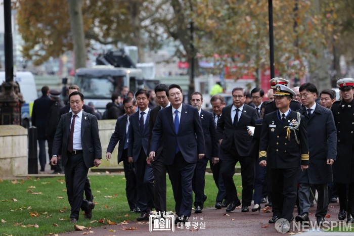 [서울=뉴스핌]윤석열 대통령이 21일(현지시간) 런던 한국전 참전 기념비 참배를 위해 입장하고 있다. [사진=대통령실] 2023.11.22 photo@newspim.com