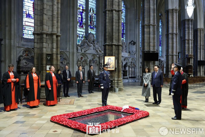 [서울=뉴스핌]윤석열 대통령이 21일(현지시간) 런던 웨스트민스터 사원의 무명 용사의 묘를 참배하고 있다. [사진=대통령실] 2023.11.22 photo@newspim.com