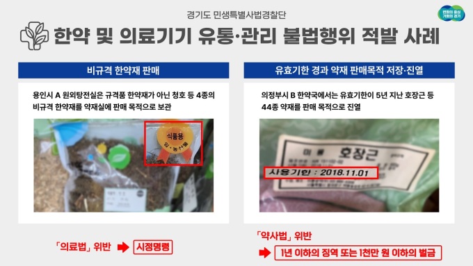 | 유효기한이 경과한 한약재를 보관한 한약취급업소와 허가받은 의료기기의 사용 목적과 다른 효능·효과가 있다고 거짓 광고한 의료기기 판매업소들이 경기도 민생특별사법경찰단에 대거 적발됐다. [사진=경기도] |