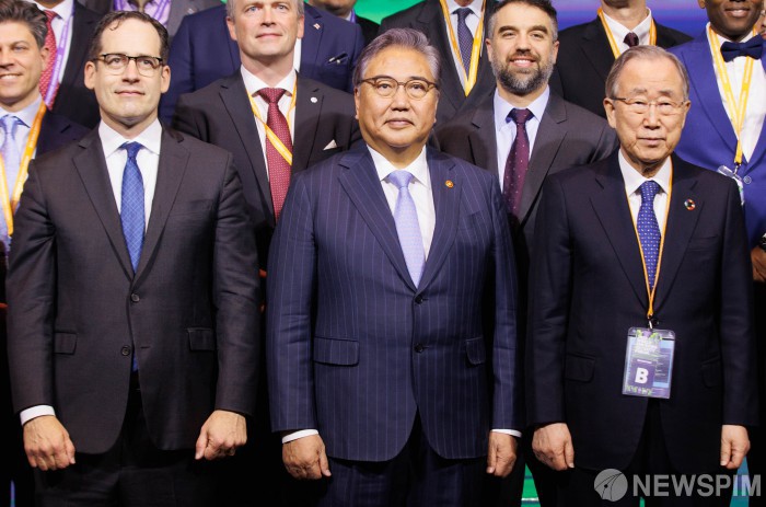 [서울=뉴스핌] 윤창빈 기자 = 리차드 폰테인 신미국안보센터 CEO, 박진 외교부 장관, 반기문 전 UN 사무총장과 참석자들이 5일 오전 서울 용산구 그랜드 하얏트에서 열린 2023 제3차 세계신안보포럼에서 기념촬영을 하고 있다. 2023.12.05 pangbin@newspim.com