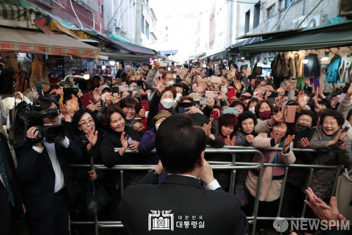[서울=뉴스핌]윤석열 대통령이 6일 부산 중구 깡통시장을 방문해 시민들의 환호에 화답하고 있다. [사진=대통령실] 2023.12.06 photo@newspim.com