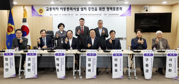 건설교통위원회는 12일 오후 도의회 중회의실에서 열린 '교통약자 이동편의시설 설치 증진을 위한 정책토론회'에서 김종배(더불어민주당·시흥4) 위원장이 좌장을 맡은 가운데 김동희(더불어민주당·부천6) 의원을 비롯해 보건복지위원회 최종현(더불어민주당·수원7) 위원장이 참석했으며, 박재용(더불어민주당·비례) 의원 등이 토론자로 참여했다.