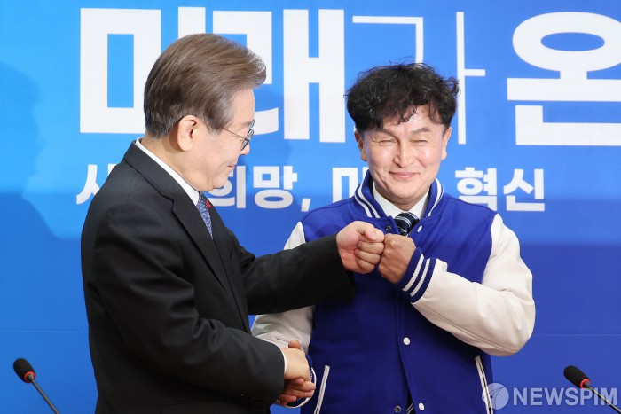 [서울=뉴스핌] 이형석 기자 = 이재명 더불어민주당 대표가 18일 오전 서울 여의도 국회에서 열린 인재영입식에서 류삼영 전 총경과 주먹인사를 하고 있다. 2023.12.18 leehs@newspim.com