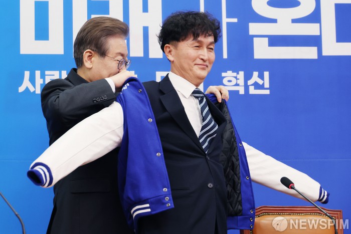 [서울=뉴스핌] 이형석 기자 = 이재명 더불어민주당 대표가 18일 오전 서울 여의도 국회에서 열린 인재영입식에서 류삼영 전 총경에게 당 점퍼를 입혀주고 있다. 2023.12.18 leehs@newspim.com