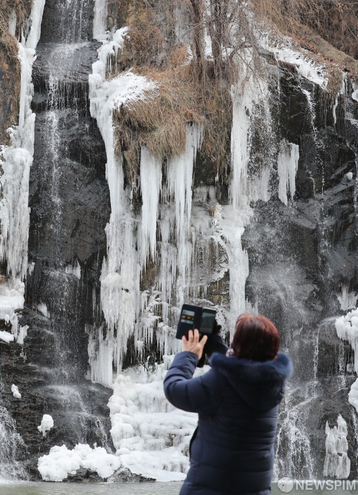 [서울=뉴스핌] 최지환 기자 = 북극한파가 이어지는 19일 오후 서울 서대문구 홍제천 인공폭포에서 한 시민이 고드름이 맺힌 폭포를 촬영하고 있다. 기상청은 이번 주말까지 강추위가 이어진다고 예보했다. 2023.12.19 choipix16@newspim.com