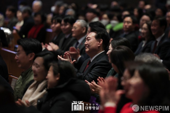 [서울=뉴스핌] 윤석열 대통령이 25일 서울 중구 정동제일교회에서 열린 성탄 예배에서 공연을 관람하며 박수를 치고 있다. [사진=대통령실] 2023.12.25 photo@newspim.com