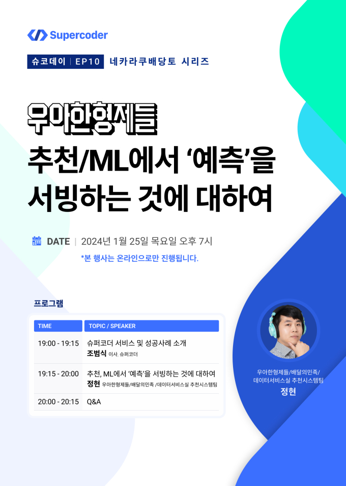이번 슈코데이는 '슈코데이 네카라쿠배당토 시리즈'의 네 번째 강의로 우아한 형제들의 '추천 서비스'에 대한 특강이 진행된다. 머신러닝 모델을 효과적으로 제공하기 위해 우아한 형제들의 추천시스템팀이 밝히는 '서빙'의 기술을 알아보고 추천/머신러닝(ML) 모델의 대고객 서비스 사례를 바탕으로 성공적인 전략과 시스템 설계에 대해 소개할 예정이다.
