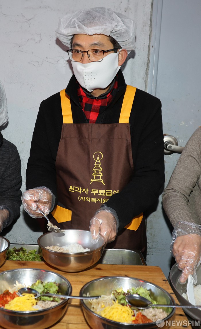 [서울=뉴스핌] 양윤모 기자 = 계속되는 대설 및 한파상황속 정호원 보건복지부 대변인이 24일 오전 서울 종로구 원각사 탑골 노인 무료급식소를 방문 배식을 담당하고 있다. 2024.01.24 yym58@newspim.com