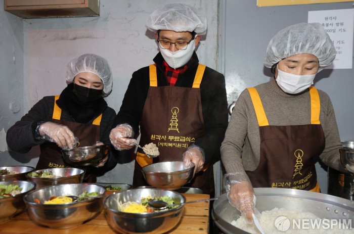 [서울=뉴스핌] 양윤모 기자 = 계속되는 대설 및 한파상황속 정호원 보건복지부 대변인이 24일 오전 서울 종로구 원각사 탑골 노인 무료급식소를 방문 배식을 담당하고 있다. 2024.01.24 yym58@newspim.com