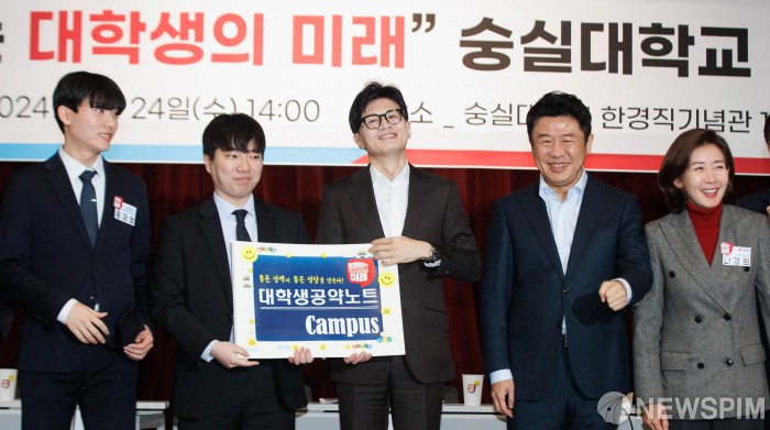 [서울=뉴스핌] 윤창빈 기자 = 한동훈 국민의힘 비상대책위원장과 참석자들이 24일 오후 서울 동작구 숭실대학교 한경직기념관에서 열린 <함께하는 대학생의 미래> 대학생 현장간담회에서 기념촬영을 하고 있다. 2024.01.24 pangbin@newspim.com
