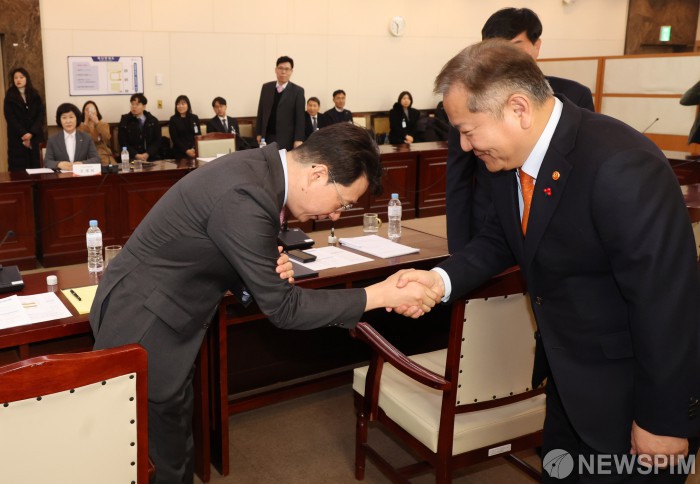 [서울=뉴스핌] 김학선 기자 = 이상민 행정안전부 장관이 25일 정부서울청사에서 열린 착한가격업소 이용 활성화를 위한 업무협약식에서 카드사 대표들과 인사하고 있다. 이날 협약으로 착한가격업소에서 국내 9개 카드사 카드로 1만원 이상 카드결제 시 1회당 2000원 할인 혜택이 제공된다. 2024.01.25 yooksa@newspim.com
