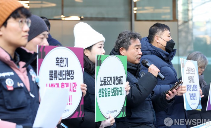 [서울=뉴스핌] 최지환 기자 = 민병조 공공운수노조 전국물류센터지부장이 31일 오전 서울 중구 서울지방고용노동청 앞에서 열린 물류센터 노동안전 및 임금 실태조사 결과 발표 기자회견에서 발언하고 있다. 2024.01.31 choipix16@newspim.com