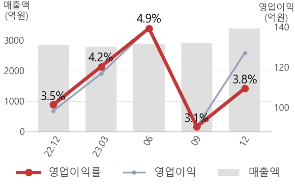 영업이익률을 자세히 살펴보면, 매출은 3373억으로 전년동기 대비해서 19% 증가하였고, 영업이익도 127억으로 29% 증가하면서 전체적으로 실적이 좋아진 것을 알 수 있는데 매출 증가폭에 비해 영업이익 증가폭이 더 커서 영업이익률도 상승한 것을 알 수 있다.