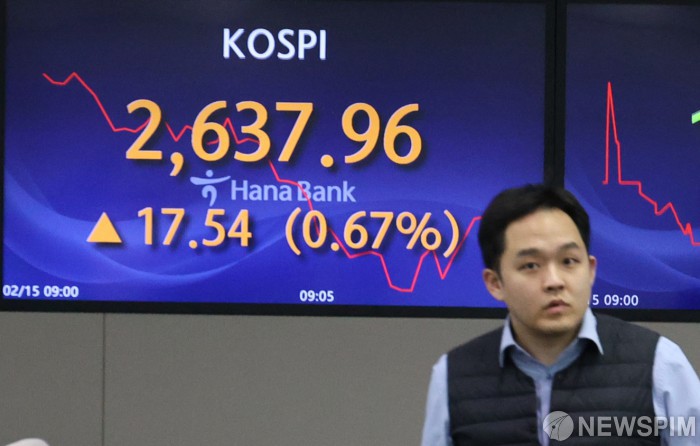 [서울=뉴스핌] 양윤모 기자 = 15일 코스피가 전날 종가보다 22.93포인트(0.88%)상승하며 2,643.35로 시작한 서울 중구 하나은행 딜링룸에서 직원들이 업무를 보고 있다. 이날 코스닥은6.90포인트(0.81%)상승한 860.29, 서울외환시장에서 은 2.40원 하락한 1,333.00원에 시작했다. 2024.02.15 yym58@newspim.com