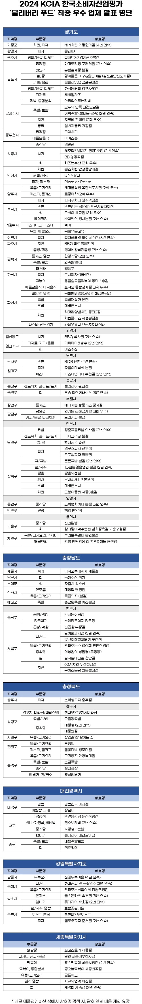 [서울=뉴스핌] 오경진 기자 = 대한소비자협의회가 주최하고 한국소비자평가가 주관하는 <2024 KCIA 한국소비자산업평가 '딜리버리 푸드'> 경기, 충청, 대전, 세종, 강원 지역의 평가 결과가 발표됐다.