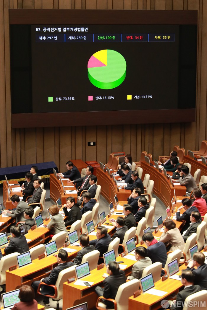 [서울=뉴스핌] 이형석 기자 = 29일 오후 서울 여의도 국회에서 열린 제413회 국회(임시회) 제06차 본회의에서 공직선거법 일부개정법률안이 가결되고 있다. 2024.02.29 leehs@newspim.com