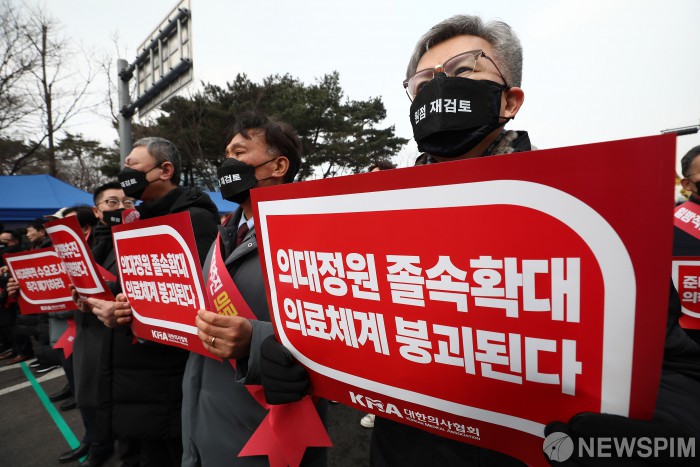 [서울=뉴스핌] 정일구 기자 = 김택우 대한의사협회 비상대책위원장이 3일 오후 서울 영등포구 여의대로에서 열린 의대정원 증원 및 필수의료 패키지 저지를 위한 전국의사 총궐기대회에서 손피켓을 들고 있다. 2024.03.03 mironj19@newspim.com