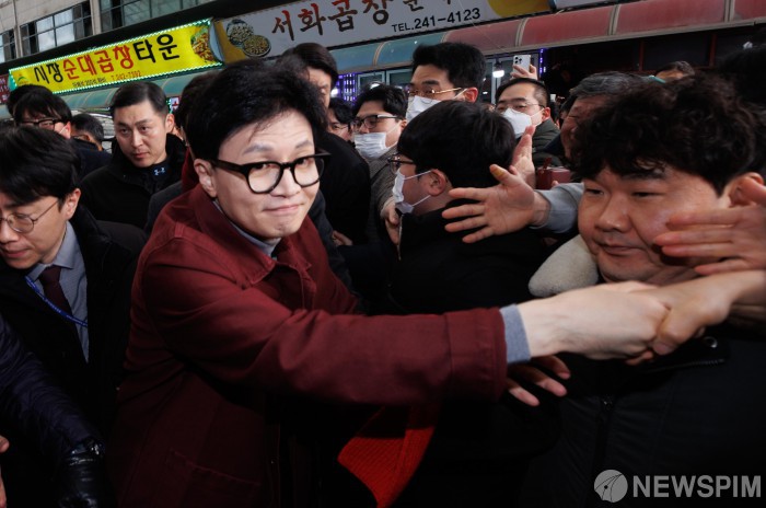 [수원=뉴스핌] 윤창빈 기자 = 한동훈 국민의힘 비상대책위원장이 7일 오후 경기 수원시 지동못골시장 상인연합회 간담회에 참석하며 시민들과 인사를 나누고 있다. 2024.03.07 pangbin@newspim.com