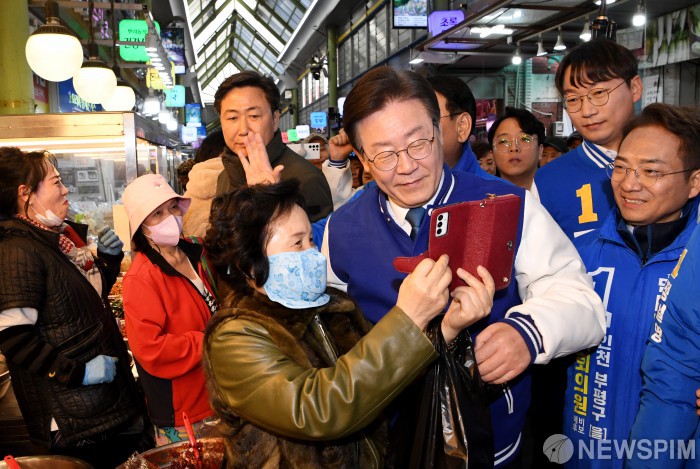 [인천=뉴스핌] 이형석 기자 = 이재명 더불어민주당 대표가 20일 오후 인천 서구 정서진중앙시장을 방문해 인천에 출마한 각 지역구 후보들과 함께 시민들에게 인사하고 있다. 2024.03.20 leehs@newspim.com
