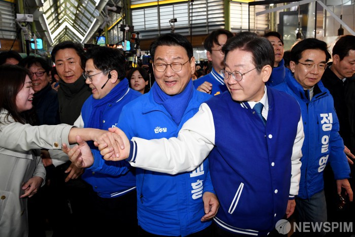 [인천=뉴스핌] 이형석 기자 = 이재명 더불어민주당 대표가 20일 오후 인천 서구 정서진중앙시장을 방문해 인천에 출마한 각 지역구 후보들과 함께 시민들에게 인사하고 있다. 2024.03.20 leehs@newspim.com