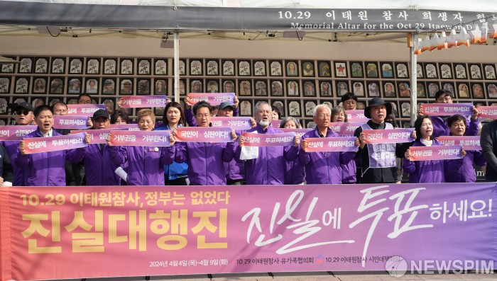 [서울=뉴스핌] 최지환 기자 = 이태원 참사 유가족과 시민단체 회원들이 4일 오전 서울 중구 서울시청 앞에서 '10.29 이태원 참사, 정부는 없었다! 진실대행진' 출발을 알리는 기자회견에서 구호를 외치고 있다. 2024.04.04 choipix16@newspim.com
