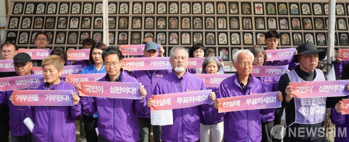 [서울=뉴스핌] 최지환 기자 = 이태원 참사 유가족과 시민단체 회원들이 4일 오전 서울 중구 서울시청 앞에서 '10.29 이태원 참사, 정부는 없었다! 진실대행진' 출발을 알리는 기자회견에서 피켓을 들고 있다. 2024.04.04 choipix16@newspim.com