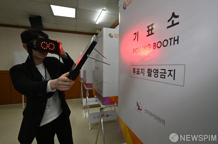 [서울=뉴스핌] 이호형 기자 = 제22대 국회의원선거 사전투표를 하루 앞둔 4일 서울 강남구 삼성2동 주민센터에 마련된 투표소에서 선관위 관계자가 카메라탐지기와 금속탐지기를 이용해 불법카메라 설치 점검을 하고 있다. 2024.04.04 leemario@newspim.com