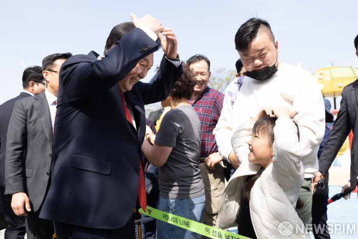 [서울=뉴스핌] 윤석열 대통령이 5일 부산 강서구 명지근린공원에서 열린 제79회 식목일 기념행사에서 한 어린이와 하트를 만들고 있다. [사진=대통령실] 2024.04.05 photo@newspim.com