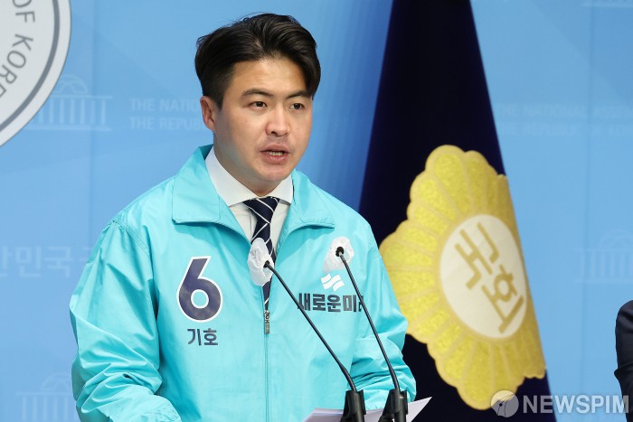 [서울=뉴스핌] 이형석 기자 = 오영환 새로운미래 총괄상임선대위원장이 9일 오전 서울 여의도 국회 소통관에서 제22대 총선 지지호소 기자회견을 열고 있다. 2024.04.09 leehs@newspim.com