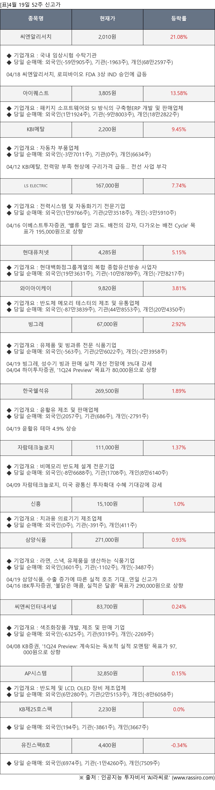 ※ 관련 종목: 씨엔알리서치, 아이퀘스트, KBI메탈, LS ELECTRIC, 현대퓨처넷, 와이아이케이, 빙그레, 한국쉘석유, 자람테크놀로지, 신흥, 삼양식품, 씨앤씨인터내셔널, AP시스템, KB제25호스팩, 유진스팩8호