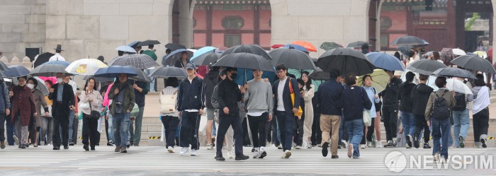 [서울=뉴스핌] 이형석 기자 = 전국적으로 비가 내리는 20일 오후 서울 종로구 광화문광장 인근에서 시민들이 우산을 들고 발걸음을 재촉하고 있다. 기상청은 비가 내리면서 황사와 미세먼지는 점차 해소될 것으로 예보했다. 2024.04.20 leehs@newspim.com