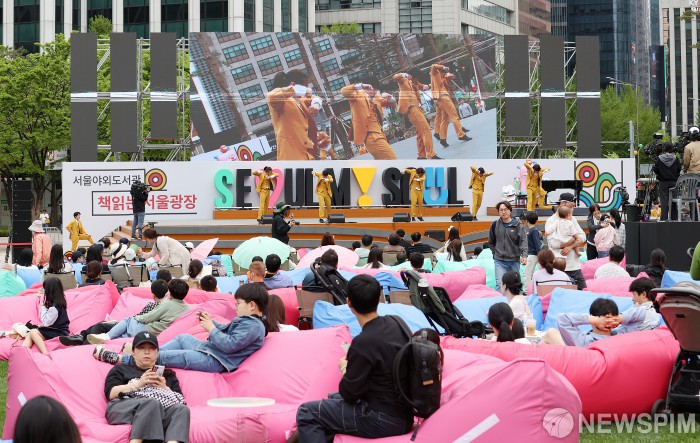 [서울=뉴스핌] 정일구 기자 = 서울야외도서관 개장 첫 주말을 맞은 21일 오후 서울 중구 서울광장에서 열린 책읽는 서울광장 개막식에서 공연이 펼쳐지고 있다. 서울야외도서관은 오는 11월 10일까지 서울광장(책읽는 서울광장), 광화문광장(광화문 책마당), 청계천(책읽는 맑은 냇가) 일원에서 운영된다. 2024.04.21 mironj19@newspim.com