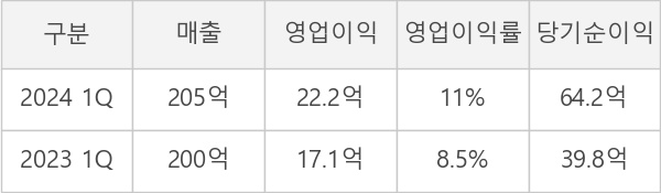 ◆ 1Q 실적, 매출액 205억원 전년동기 대비 2.0% 증가... 영업이익 30%↑