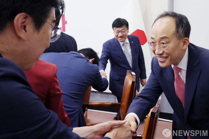 [서울=뉴스핌] 이형석 기자 = 추경호 국민의힘 원내대표가 23일 오전 서울 여의도 국회에서 열린 원내대책회의에서 동료의원들과 인사를 나누고 있다. 2024.07.23 photo@newspim.com