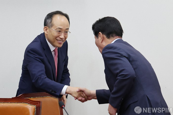 [서울=뉴스핌] 이형석 기자 = 추경호 국민의힘 원내대표가 23일 오전 서울 여의도 국회에서 열린 원내대책회의에서 동료의원들과 인사를 나누고 있다. 2024.07.23 photo@newspim.com