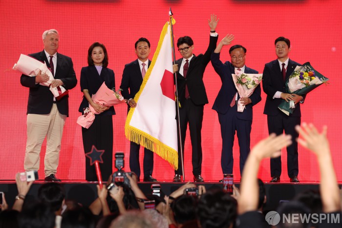 [고양=뉴스핌] 윤창빈 기자 = 한동훈 국민의힘 신임 당대표가 23일 경기 고양 킨텍스에서 열린 제4차 국민의힘 전당대회에서 당대표로 선출된 뒤 신임 지도부들과 기념촬영 하고 있다. 2024.07.23 pangbin@newspim.com