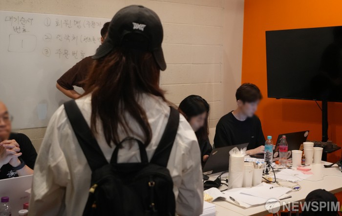 [서울=뉴스핌] 최지환 기자 = 티몬, 위메프 등 큐텐 계열사의 정산 지연 사태가 이어지는 가운데 26일 오전 서울 강남구 티몬 사무실에서 피해자들이 환불을 기다리고 있다. 2024.07.26 choipix16@newspim.com