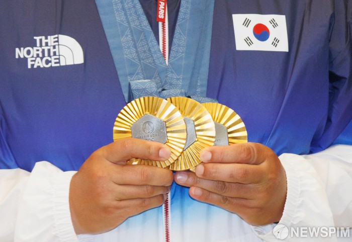 [영종도=뉴스핌] 윤창빈 기자 = 김우진 양궁 국가대표팀 선수가 6일 오전 인천국제공항 제2터미널 입국장에서 금메달을 들고 기념촬영을 하고 있다. 2024.08.06 pangbin@newspim.com