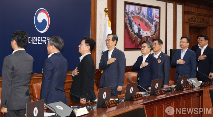 [서울=뉴스핌] 김학선 기자 = 한덕수 국무총리를 비롯해 국무위원들이 6일 정부서울청사에서 열린 국무회의에서 국기에 대한 경례를 하고 있다. 이날 국무회의에서는 야당이 강행 처리한 '방송4법'에 대한 재의요구안을 의결했다. 2024.08.06 yooksa@newspim.com