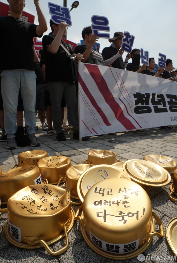 [서울=뉴스핌] 최지환 기자 = 전국공무원노동조합 2030청년위원회 회원들이 6일 서울 용산구 대통령실 앞에서 열린 임금 수당 현실화 2024년 청년공무원 100인 기자회견을 열고 있다. 2024.08.06 choipix16@newspim.com