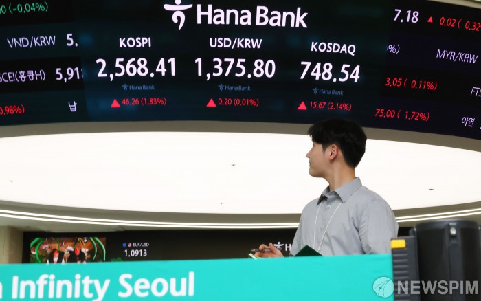 [서울=뉴스핌] 양윤모 기자 = 뉴욕 증시가 미국 경기 침체에 대한 공포 심리 완화로 상승 마감한 가운데, 7일 오후 3시 30분 코스피가 전 거래일 종가보다 46.26포인트(1.83%) 상승하며 2,568.41로, 코스닥은 15.67포인트(2.14%) 상승한 748.54로 장을 마감했다. 서울 외환시장에서 달러/원 환율은 전날 대비 0.50원(0.04%) 상승한 1,376.10원에 오후 거래를 마감하며, 서울 중구 하나은행 딜링룸에서 직원들이 업무를 보고 있다. 2024.08.07 yym58@newspim.com
