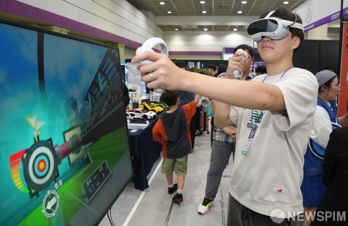 [서울=뉴스핌] 최지환 기자 = 8일 오후 서울 강남구 코엑스에서 열린 '2024에듀플러스위크 미래교육박람회'에서 업체 관계자가 VR을 이용한 양궁 교육 프로그램을 시연하고 있다. 2024.08.08 choipix16@newspim.com
