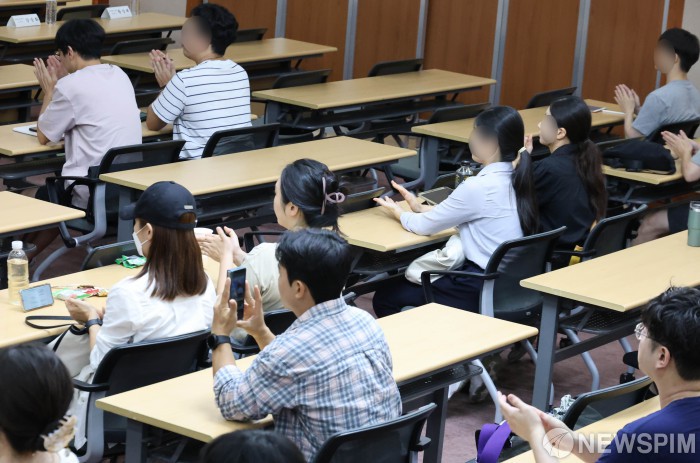 [서울=뉴스핌] 양윤모 기자 = 정부의 의료 개혁 추진에 반발해 병원을 떠난 전공의들이 11일 오후 서울특별시의사회(회장 황규석)가 마련한 '제2차 전공의 실무 교육'에 참여하고 있다. 서울특별시의사회관 5층 강당에서 이번 교육은 7,645명의 전공의들이 개원 준비·구직 등 새로운 일자리를 위해 서울특별시의사회가 추진한 프로그램이다. 이번 실무 교육 세부 프로그램은 △개원 진료의 첫걸음 △건강보험 청구 요령 △지역 사회에서의 왕진·방문 진료의 필요성 △최고의 의원급 외과의가 되기 위한 필수 생존 가이드 △봉직의가 알아야 할 노무 상식 △봉직의가 알아야 할 세무 상식 등으로 구성됐다. 2024.08.11 yym58@newspim.com