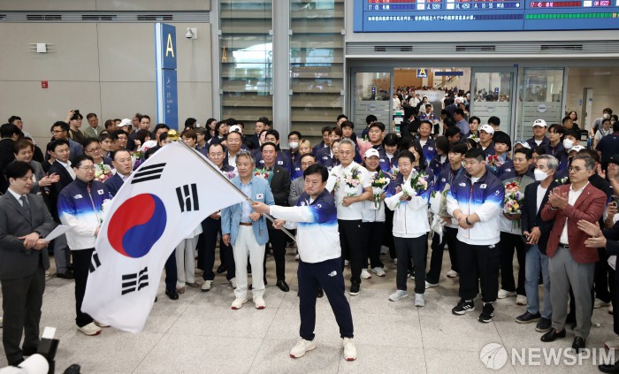 [영종도=뉴스핌] 정일구 기자 = 정강선 2024 파리올림픽 대한민국 선수단장이 13일 오후 인천국제공항 제2여객터미널을 통해 귀국해 태극기를 흔들고 있다. 2024.08.13 mironj19@newspim.com