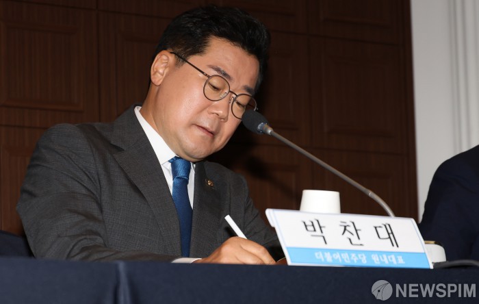 [서울=뉴스핌] 양윤모 기자 = 박찬대 더불어민주당 당대표 직무대행 겸 원내대표가 16일 오전 서울 중구 한국프레스센터 내셔널프레스클럽에서 개최된 관훈클럽 초청 토론회에 참석 메모하고 있다. 2024.08.16 yym58@newspim.com