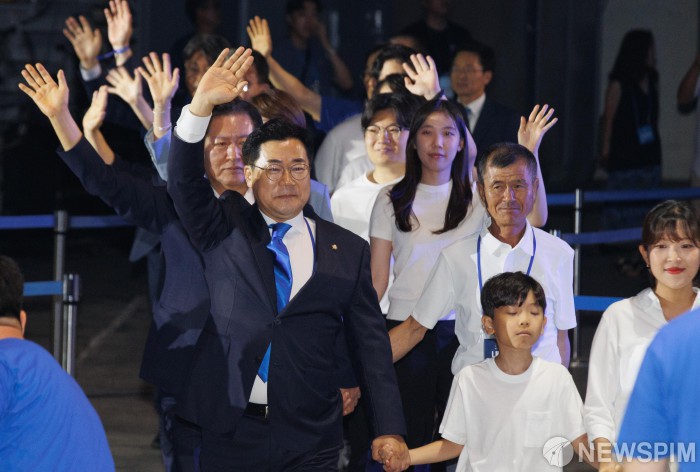 [서울=뉴스핌] 윤창빈 기자 = 박찬대 더불어민주당 대표 직무대행 겸 원내대표와 지도부 및 당원들이 18일 오후 서울 송파구 올림픽공원 KSPO돔에서 열린 더불어민주당 제1차 정기전국당원대회에 참석하고 있다. 2024.08.18 pangbin@newspim.com